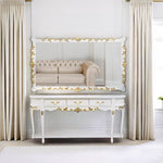Com três gavetas espaçosas, este aparador não só é esteticamente agradável, mas também funcional, oferecendo amplo espaço para armazenar e organizar seus pertences com elegância. A combinação da pintura branca com os entalhes dourados proporciona um contraste sofisticado e versátil, que se adapta a diversos tipos de decoração, desde os mais clássicos até os mais contemporâneos.