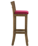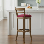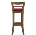 Descrição: Banqueta alta em madeira maciça com encosto, assento estofado e acabamento em Verniz Capuccino, combina elegância e funcionalidade em um só móvel.