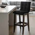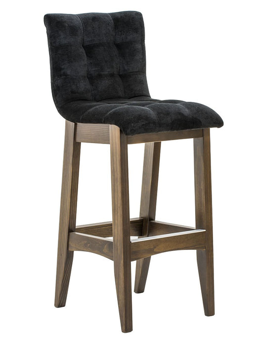 Descrição: Banqueta alta em madeira maciça com encosto e assento estofados e acabamento em Verniz, combina elegância e funcionalidade em um só móvel.