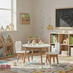 A mesa redonda proporciona um espaço acolhedor para que as crianças possam compartilhar refeições, realizar atividades escolares ou se envolver em emocionantes aventuras imaginativas. O design adorável com detalhes de coelhinhos torna cada momento à mesa uma experiência encantadora e estimulante para a criatividade.