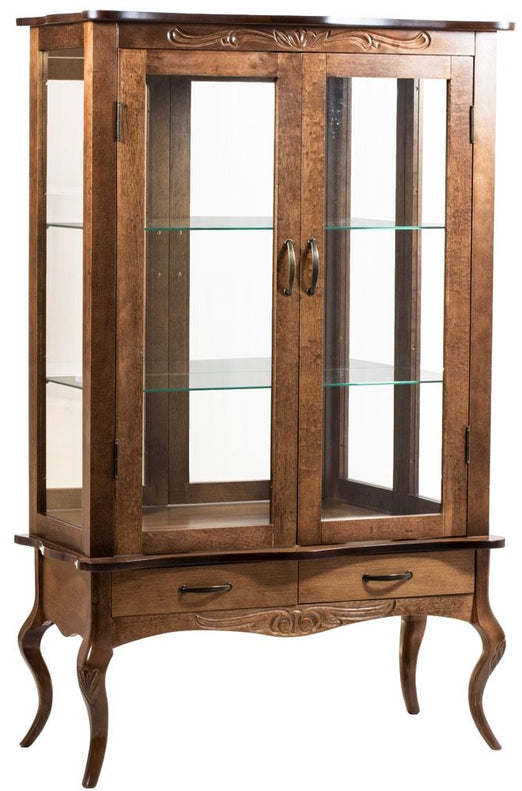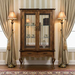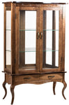 Descrição: Linda Cristaleira com duas portas e duas gavetas em Madeira Maciça e acabamento Verniz Imbuia com várias opções de cores. Detalhes entalhados à mão trazem muito charme para esta peça clássica.