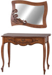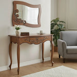 Sua estrutura é habilmente trabalhada com detalhes em estilo arabesco, que adicionam um toque de requinte ao ambiente. A gaveta oferece espaço de armazenamento prático, enquanto a moldura entalhada adiciona um elemento de beleza artesanal, destacando-se como uma obra de arte em si mesma.