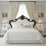 Cabeceira Entalhada Genova King com Capitonê – Verniz Capuccino Acetinado e Linho Creme