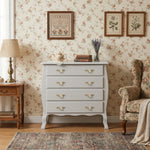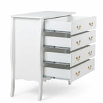 As quatro gavetas amplas correm com suavidade e proporcionam espaço generoso para organizar roupas de cama, peças de vestuário ou acessórios do dia a dia. Os puxadores em metal foram escolhidos para complementar o visual clássico do branco provençal, adicionando um toque refinado ao conjunto.