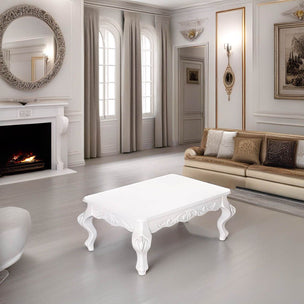 Complementando a opulência da poltrona vitoriana, a mesa de centro entalhada branca fosca serve como uma peça de transição suave e sofisticada. Com seus entalhes detalhados e acabamento fosco, ela oferece um toque de simplicidade equilibrado com a complexidade das texturas. O branco fosco traz leveza, permitindo que a mesa se destaque sem sobrecarregar o ambiente.