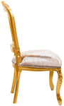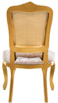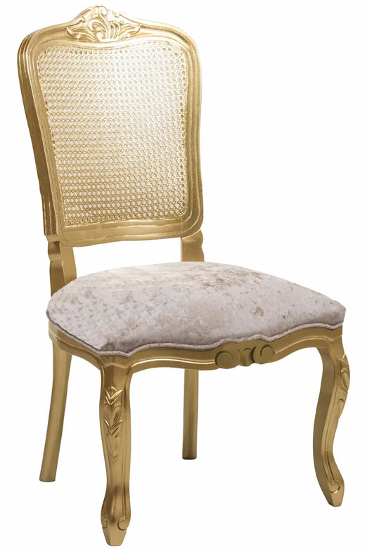 Descrição: Cadeira estilo Luis XV, entalhada à mão, feita em madeira Caixeta com encosto em Tela e acabamento em pintura Dourada. É uma peça de mobiliário que combina a elegância clássica do estilo Luís XV com a praticidade contemporânea da tela. Seu design refinado apresenta entalhes delicados e curvas suaves características do estilo Luís XV, enquanto o uso de tela no encosto adiciona um toque de modernidade e conforto.